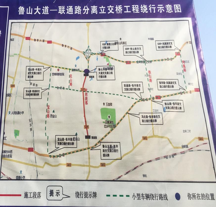 鲁山大道上的三座立交桥,目前均在规划建设中,因此,部分道路施行交通封闭,像受联通路-鲁山大道分离立交桥工程建设影响,鲁山大道(中润大道—张辛路以北)路段实行交通密闭,封闭开始时间暂未明确,截止时间为今年11月30日,届时,过境车辆要绕行G205、S102,小型车辆需绕行宝山路、花山路、铁山路、凤凰路。