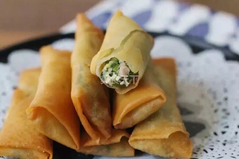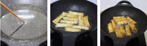 15、将油温再次升高,下入春卷中火复炸几秒钟至春卷皮金黄马上捞出控油。