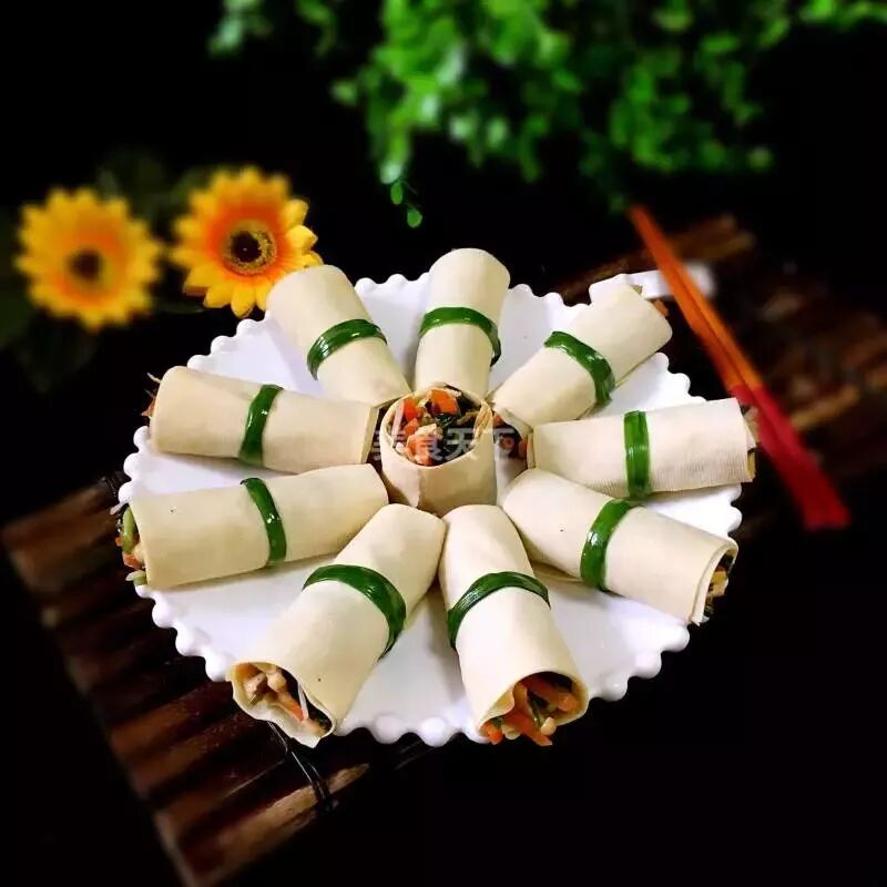 11、然后拿出一张百叶,摊上拌好的马兰头、金针菇、蛋皮、胡萝卜丝包紧,用焯好水的韭菜装饰一下即可。