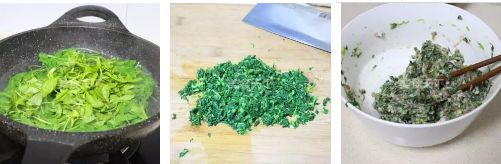 3、焯好的蒲公英叶攥干水分,剁成碎丁。