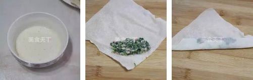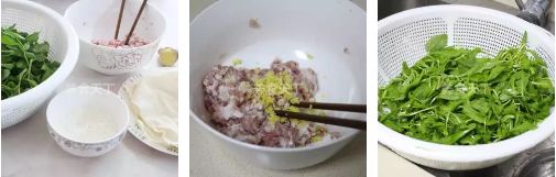 肉末200g、春卷皮 / 荠菜 / 生姜 / 蚝油 / 草果粉 / 盐 / 油 / 面粉适量。