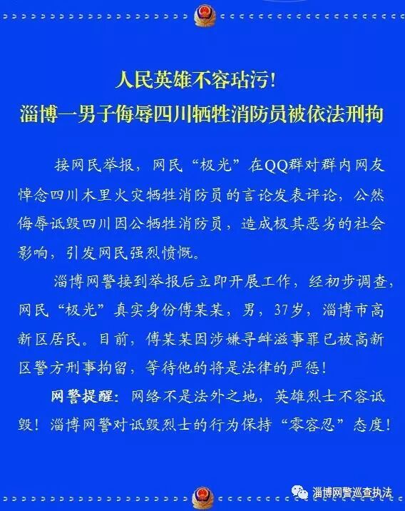 淄博网警接到举报后立即开展工作,经初步调查,网民“极光”真实身份傅某某,男,37岁,淄博市高新区居民。目前,傅某某因涉嫌寻衅滋事罪已被高新区警方刑事拘留,等待他的将是法律的严惩!
