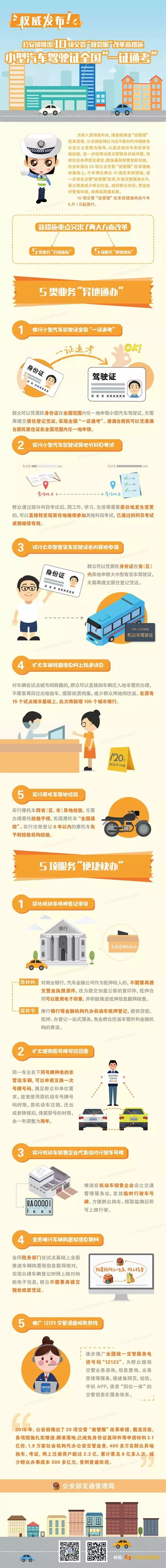 一是小车驾驶证“全国通考”。申请人可以持本人身份证在全国任一地直接申领小型汽车驾驶证,不再需要提交居住登记凭证,实现全国“一证通考”。