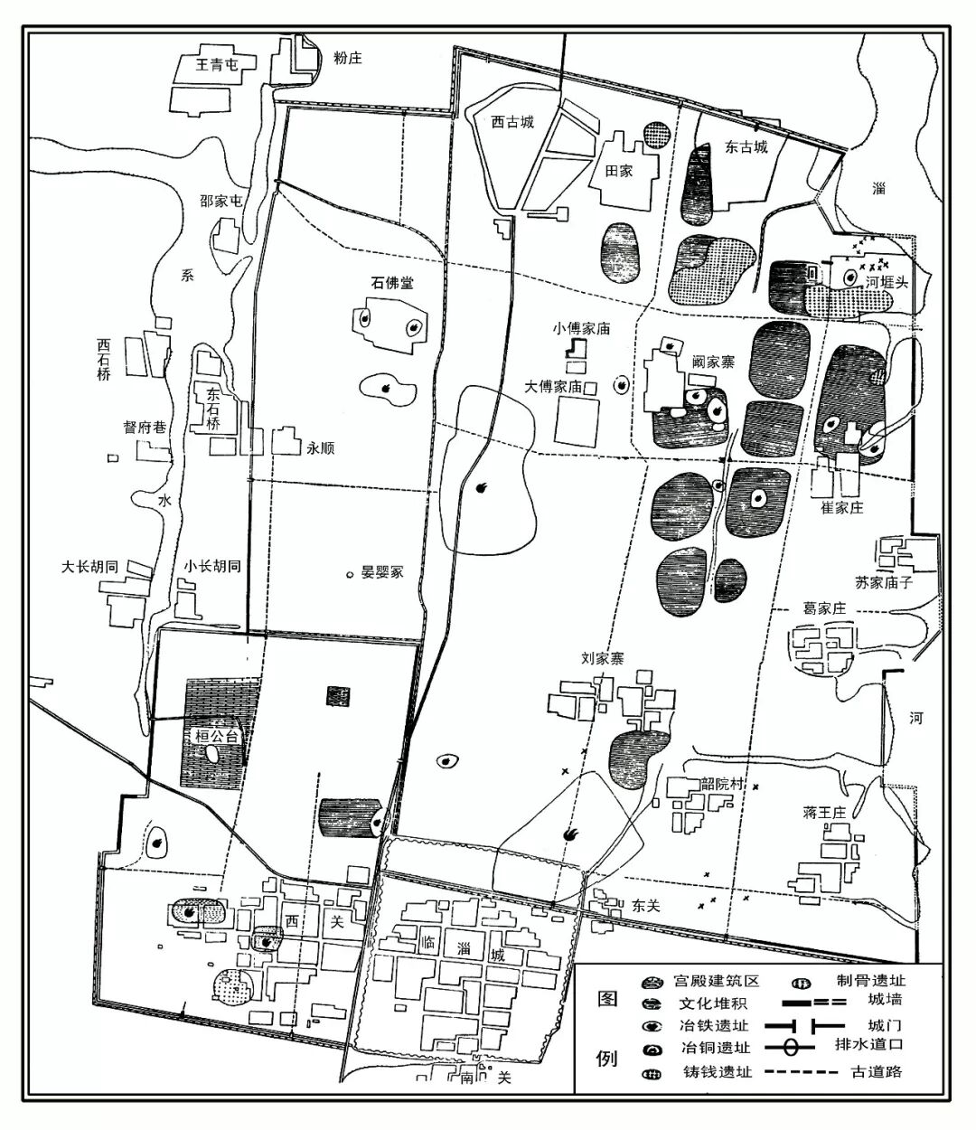 当年的齐国都城临淄距离今天的临淄区政府所在地7.5公里,主体坐落于临淄区齐都镇,故城东濒淄河,西依系水,呈两河夹一城的形制。齐国故城由大小两城组成,小城套筑于大城西南隅,总面积达20余平方公里。大城南北长4.5公里,东西长3.5公里,是官吏、平民及商人居住的郭城,城基宽30米左右,至今地面尚保存有城垣的遗迹。城的南边是官署的所在地,东北角以及西部是冶铜、冶铁、制骨、烧陶等手工业作坊区,其间还分布有商业区。小城是宫城,位于大城的西南角,平面呈长方形,东西长1.5公里,南北长2公里,周长约7公里。城的北部是宫殿区,现在尚存有高14米,直径86米的夯土台基,今称“桓公台”,是全城的制高点,传说是齐桓公在春秋时期称霸天下时,会见诸侯和检阅兵马的地方。西部是苑囿区,这里曾修建了大规模的离宫别馆,建筑华丽,景色优美。