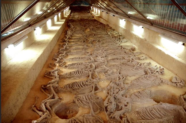 在大城内还发现了大型的贵族墓区,共20多座,在其中一座齐国国君的石椁大墓四周,发掘出一处殉马坑,全长210米,宽5米,坑内殉马在600匹以上,分两行排列,都是侧卧昂首,场面宏大,威武壮观,反映了号称“千乘之国”的齐国强盛的实力。此墓墓主人可能正是春秋后期试图恢复齐国霸业的齐景公。