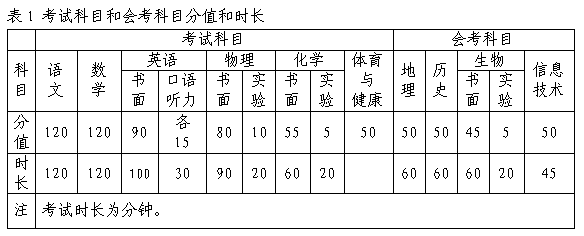 初中学业水平考试设置考试科目、会考科目和考查科目三类。考试科目为语文(含书写卷面分5分,采用扣分制)、数学、英语(含口语与听力)、物理(含实验操作)、化学(含实验操作)、体育与健康。会考科目为历史、地理、生物(含实验操作)、信息技术。考查科目为地方课程、学校课程、音乐、美术、综合实践活动。