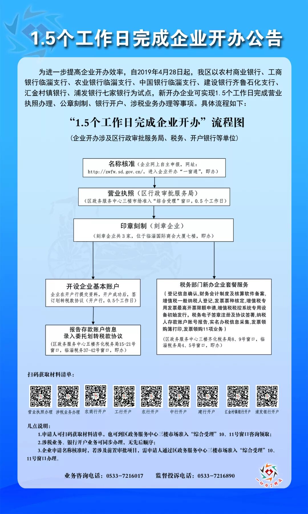 《1.5个工作日完成企业开办公告》已在临淄区政务服务中心重要通道及办理业务群众集中处张贴,流程图合理明确、简单易懂,而且群众可通过公告上的二维码获取业务办理材料清单。