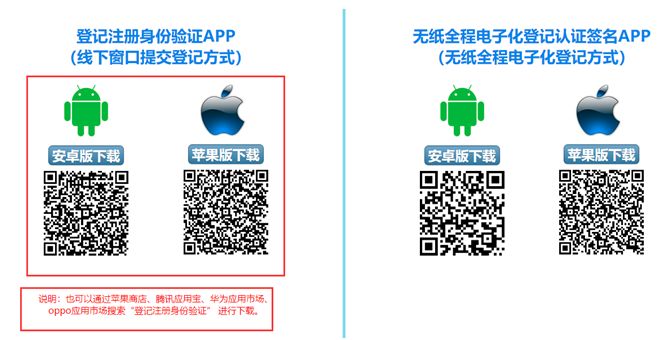 在登记注册APP下载栏目,手机下载“登记注册身份验证APP”(针对线下窗口提交方式)或“无纸全程电子化登记认证签名APP”(针对无纸全程电子化方式);