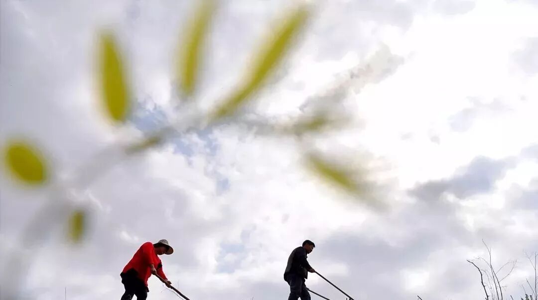 ↑4月28日,郑作霞与丈夫王寿法一起耕种家里的农田。