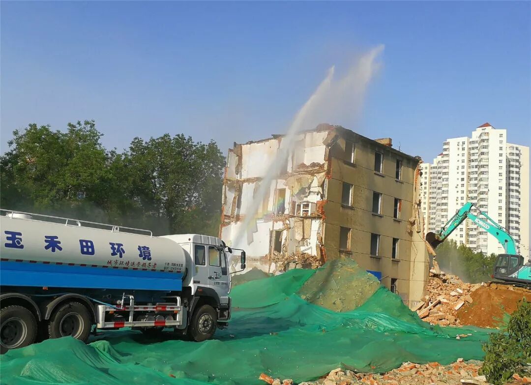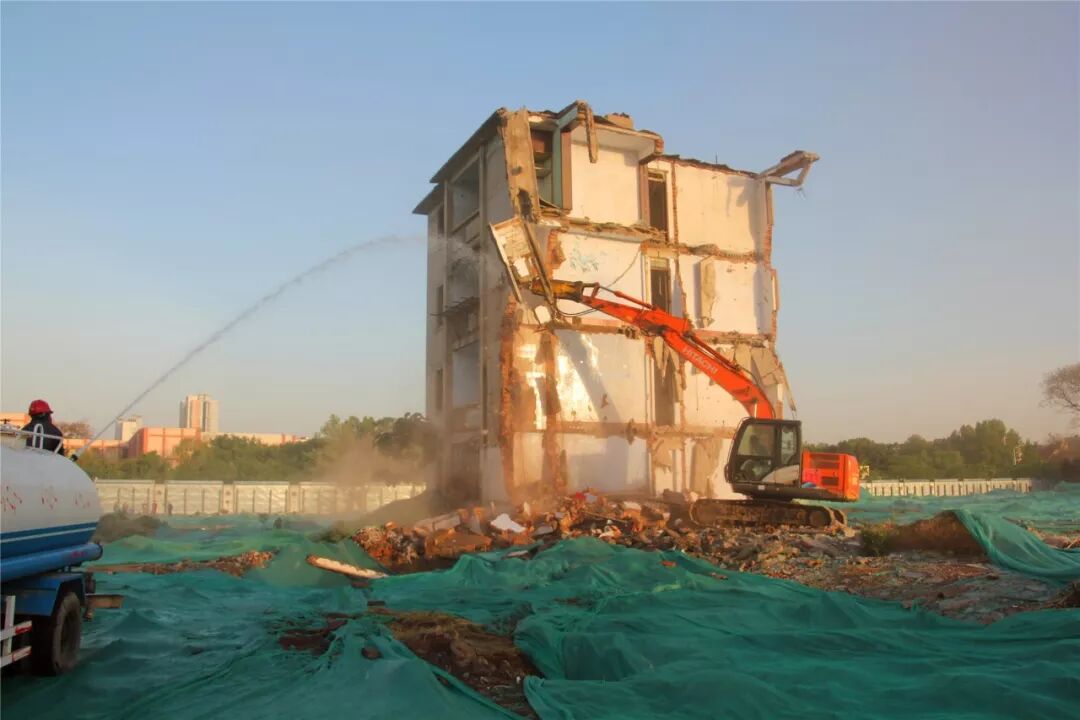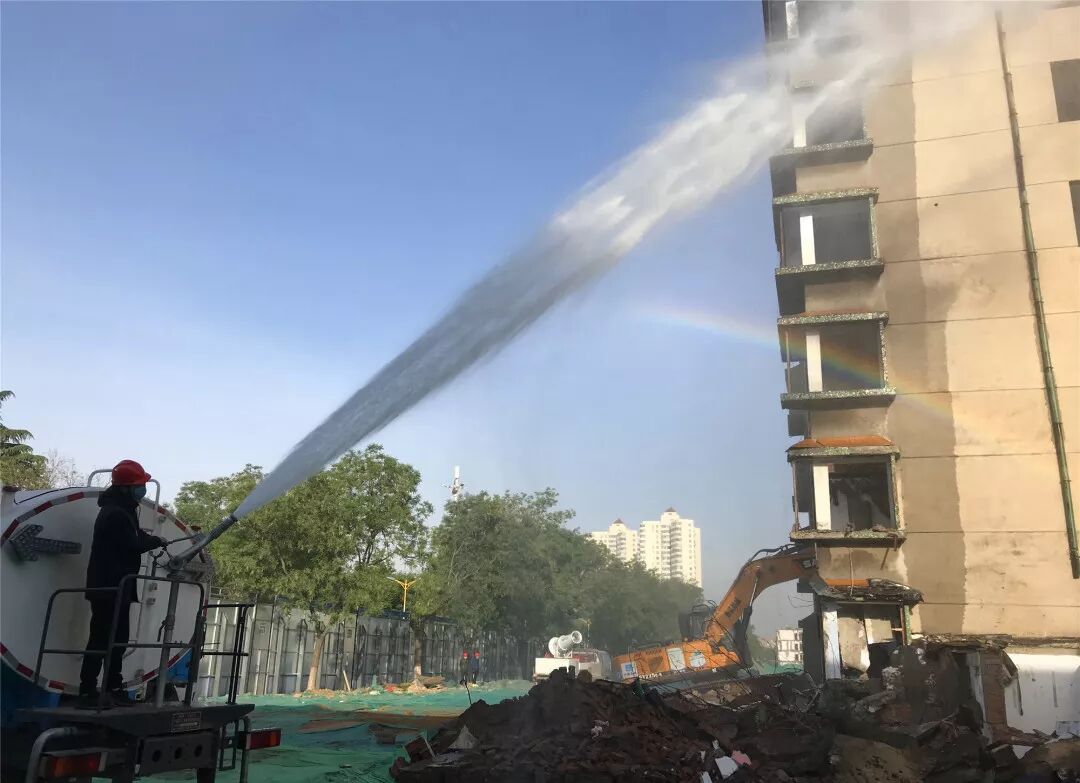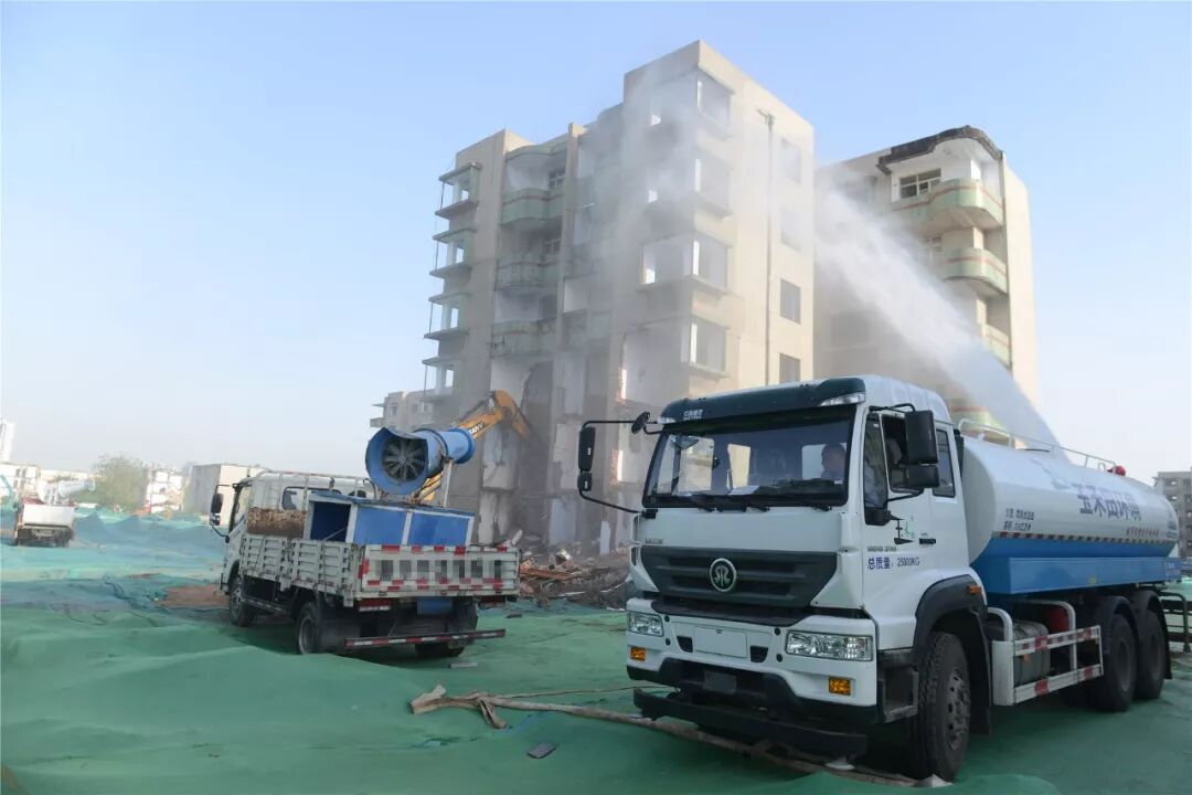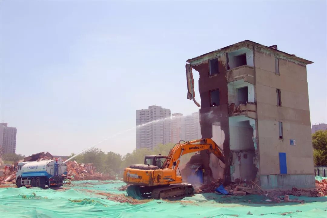 物品清运结束后,拆除开始。挖掘机、破碎机、洒水车、雾炮相互配合,现场压茬进行。