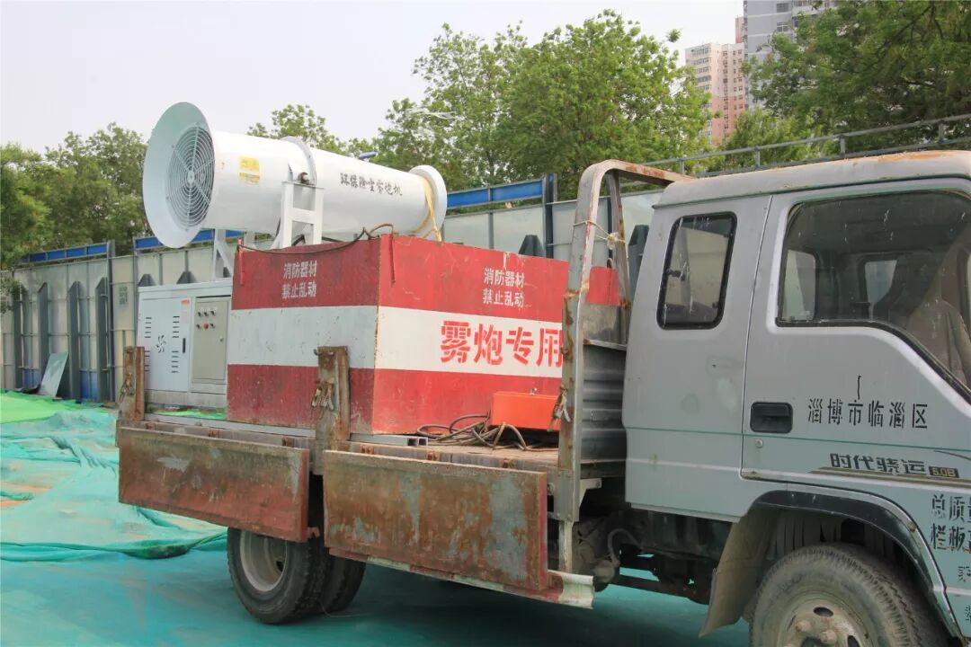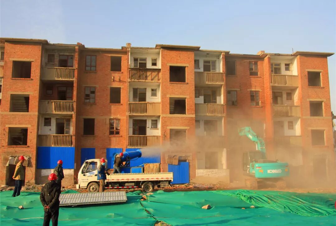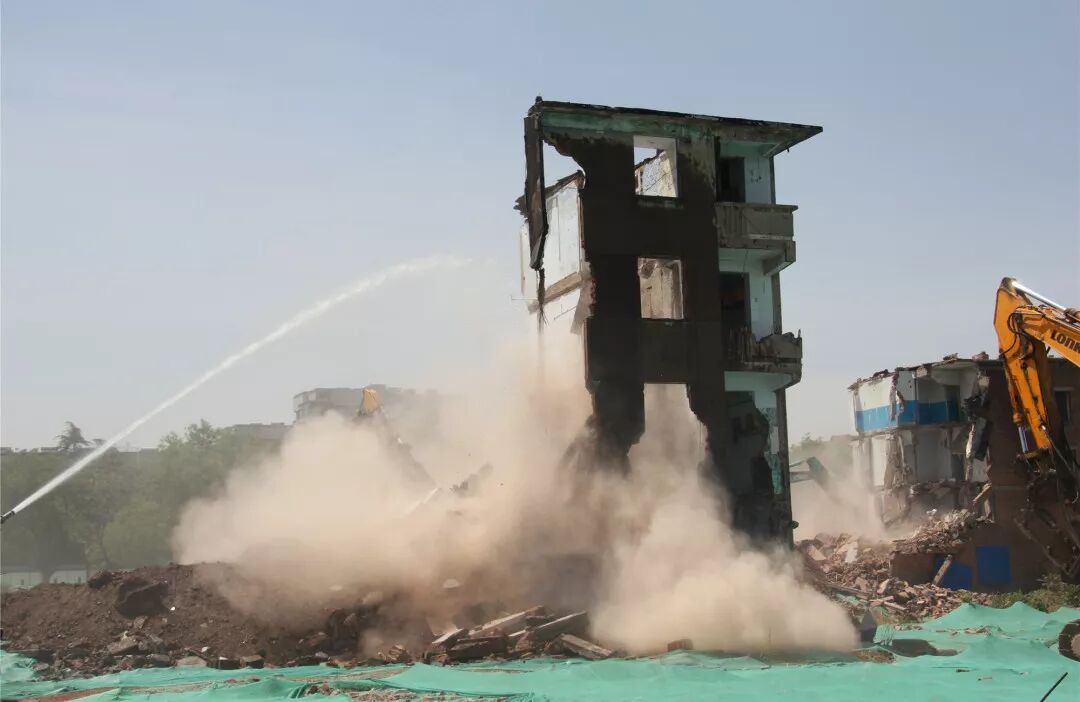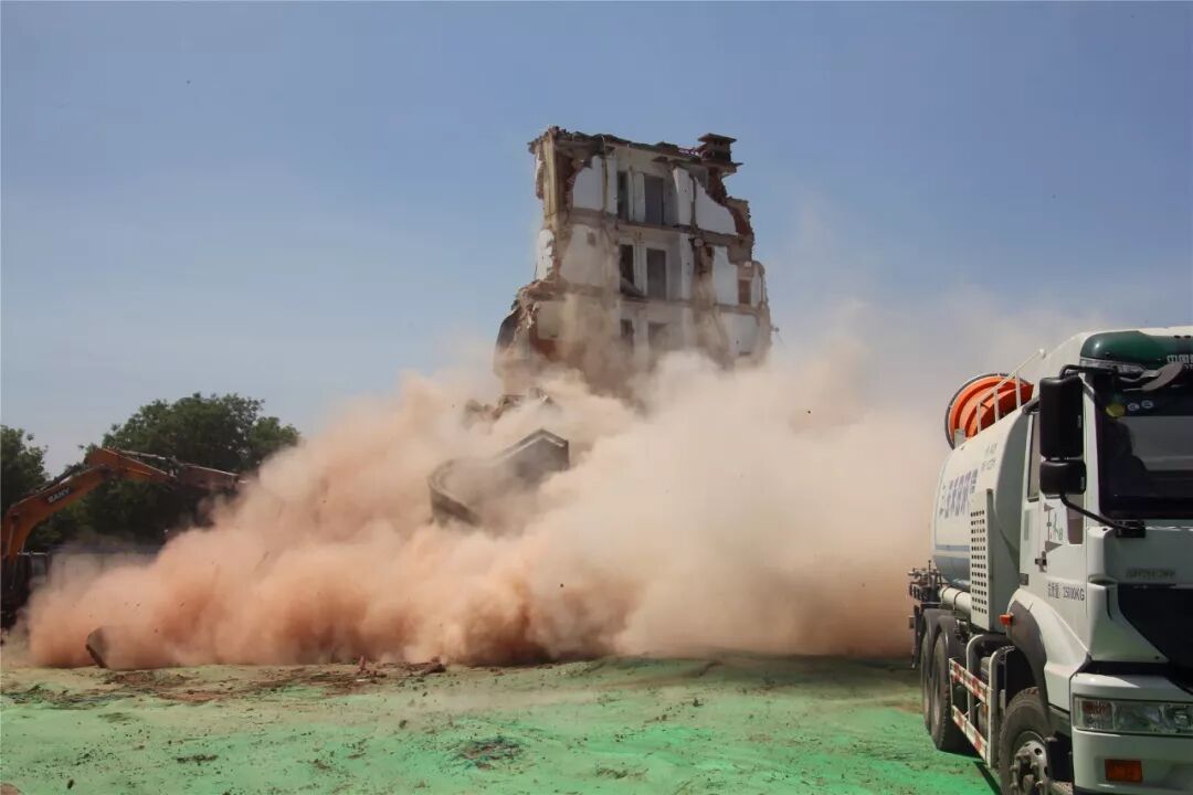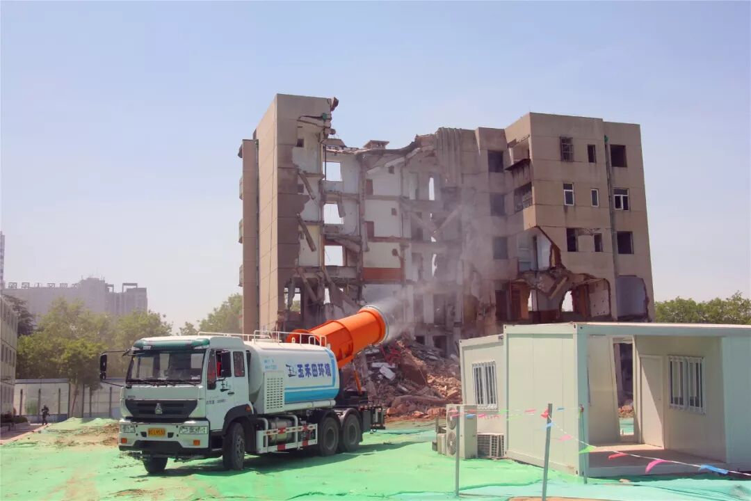 物品清运结束后,拆除开始。挖掘机、破碎机、洒水车、雾炮相互配合,现场压茬进行。