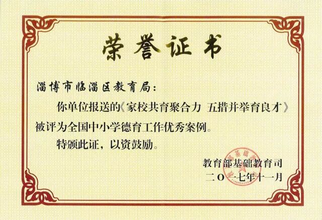 临淄区先后荣获“全国家长学校建设实验基地”“山东省家庭教育实验基地”“山东省家庭教育示范基地”等荣誉称号;
