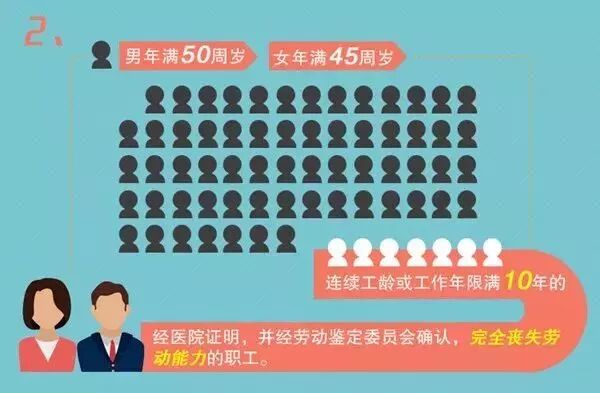 男年满50周岁,女年满45周岁,连续工龄或工作年限满10年的,经医院证明,并经劳动鉴定委员会确认,完全丧失劳动能力的职工。