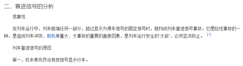 “冒进信号”是用在铁路交通上的词语,指的是前方是红灯,但列车却进去了,这种情况下可能发生列车碰撞事故。