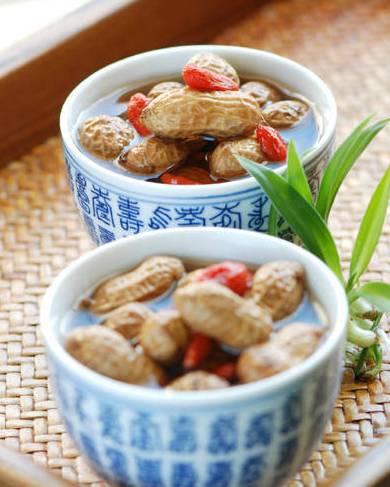 3、取密封容器,放入花生,倒入香糟汁,加入洗净的枸杞子,密封好,放入冰箱浸渍12小时以上(时间长一些更入味)即可取出食用。