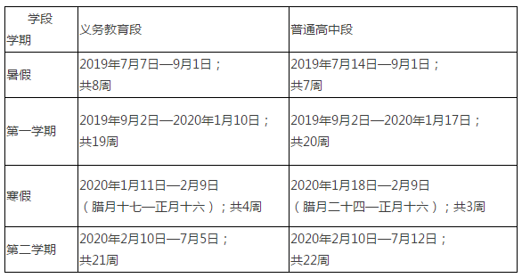 寒假时间为4周,起止日期为公历2020年1月11日至2月9日(农历2019年腊月十七至2020年正月十六)。