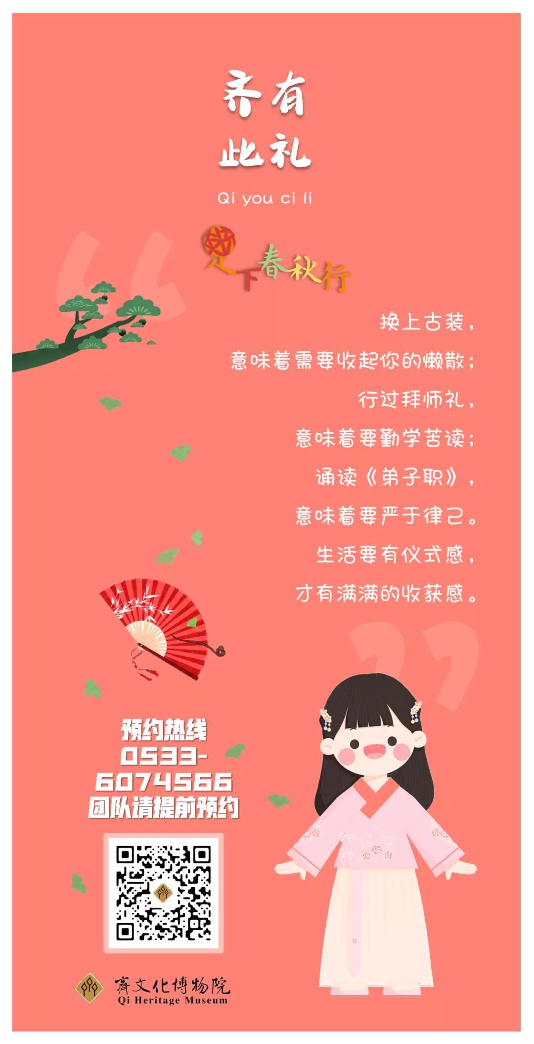 “齐有此礼”是“足下春秋行”研学游的开班仪式。现代人讲究生活要有仪式感,仪式感会使某一天与其他日子不同,使某一时刻与其他时刻不同!换上古装,意味着你需要收起你的懒散;行过拜师礼,意味着你要勤学苦读,成栋梁之才;诵读《弟子职》,意味着从此刻起你需严于律己,奋发图强。巍巍齐鲁,泱泱齐风,聚齐开蒙,博学知礼,这就是我们的研学之始——“齐有此礼”。