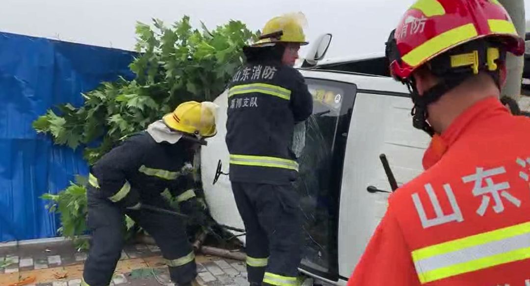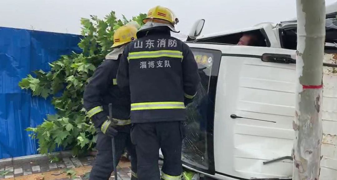 消防员了解到,这是一辆私家车在行驶过程中不慎撞到路边树木导致车辆侧翻。