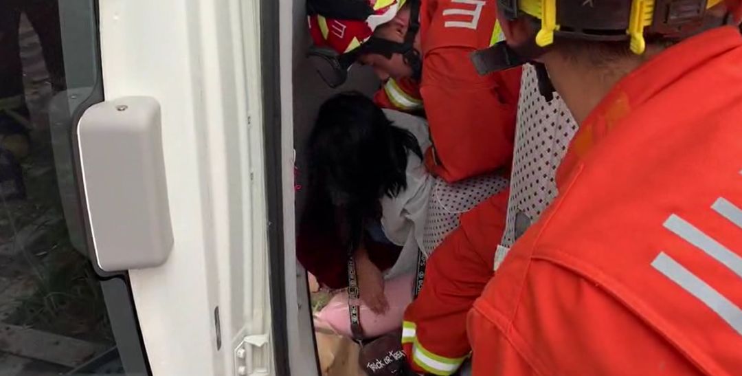 消防员立即使用破拆器材抢救被困人员,5分钟后成功将5名被困人员全部救出,无人员有生命危险,并送往医院进行检查。