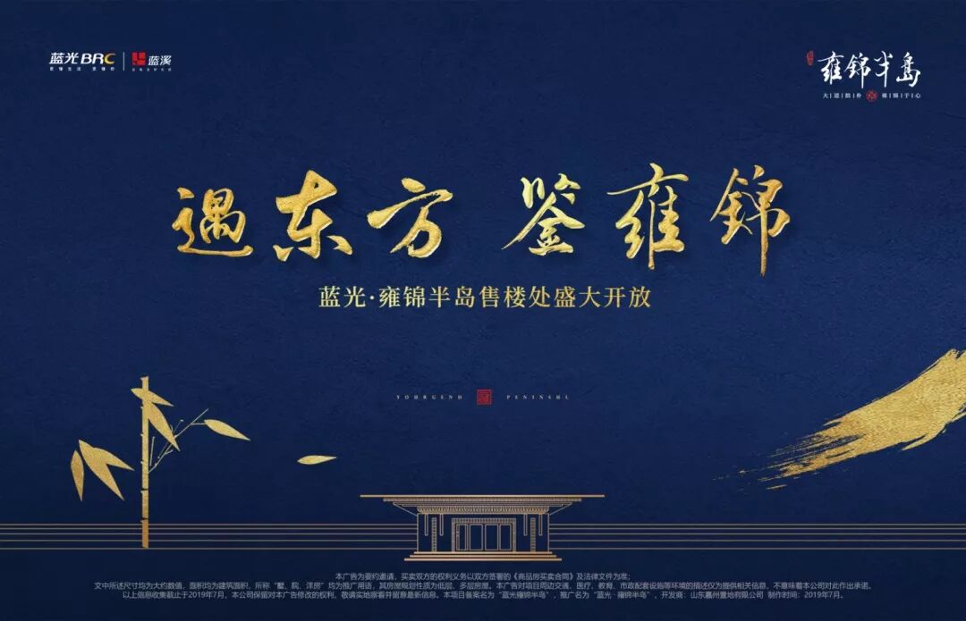 本广告为要约邀请,买卖双方的权利义务以双方签署的《商品房买卖合同》及法律文件为准;文中所述尺寸均为大约数值,面积均为建筑面积,所称“墅、院、洋房”均为推广用语,其房屋规划性质为低层、多层房屋。本广告对项目周边交通、医疗、教育、市政配套设施等环境的描述仅为提供相关信息,不意味着本公司对此作出承诺。以上信息收集截止于2019年7月,本公司保留对本广告修改的权利,敬请实地察看并留意最新信息。 本项目备案名为“蓝光雍锦半岛”,推广名为“蓝光 · 雍锦半岛”,开发商:山东嘉州置地有限公司 制作时间:2019年7月。