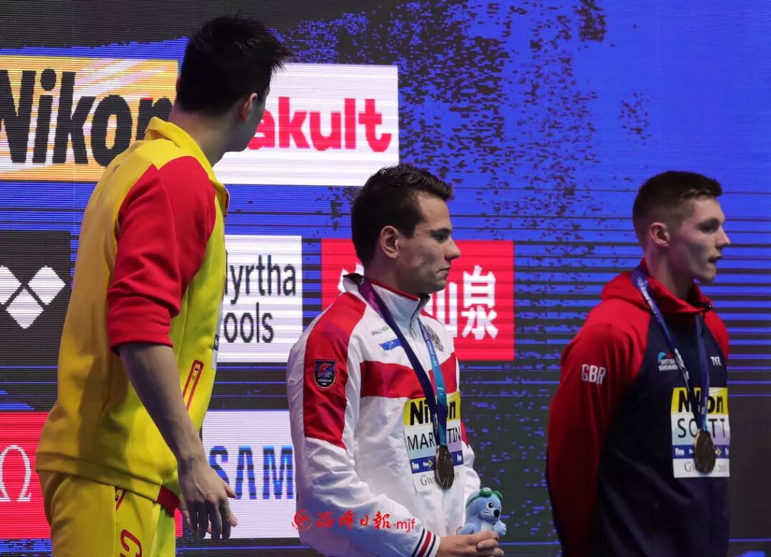 当天晚上,在男子200米自由泳决赛中,孙杨第二个触壁,不过抢先触壁的拉普塞斯因为出发犯规被取消成绩,孙杨以1分44秒93夺冠。颁奖环节,还爆发了颁奖“闹剧”,获得铜牌的英国选手斯科特·邓肯拒绝和孙杨以及亚军获得者合影。而孙杨则在领奖台发出怒吼,回应了斯科特·邓肯的不尊重行为。斯科特成为第二个“霍顿”。