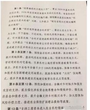 文件内容 文件围绕村庄规划、合村并居、土地、财政、金融、人才、乡村治理、重点工作、脱贫攻坚、考核等10个方面,制定了24条具体政策。