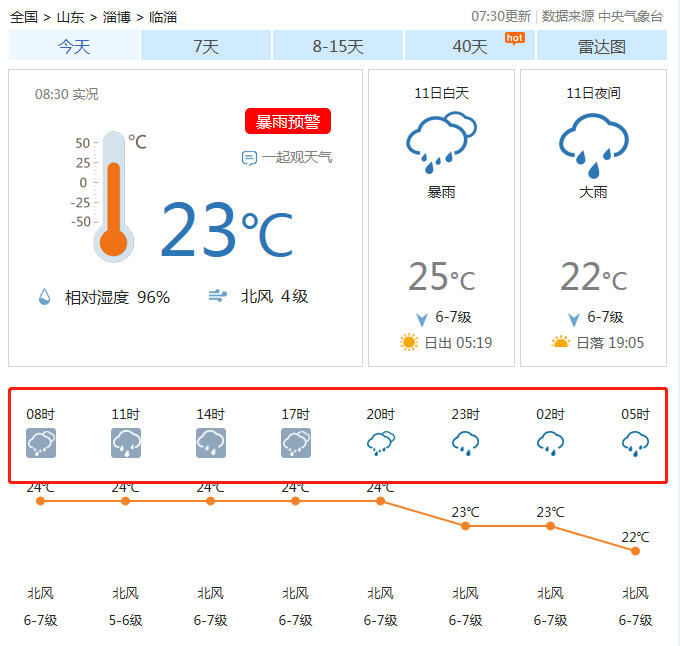 临淄区气象局2019年08月10日22时56分发布暴雨红色预警信号:受台风“利奇马”影响,目前我区部分地区已出现暴雨局部大暴雨,预计未来3小时内我区部分地区降水量将超过100毫米,今天(10日)夜间到13日,我区仍有大范围降水。为此,临淄区气象局于2019年08月10日22时56分将暴雨橙色预警信号升级为暴雨红色预警信号。提醒各有关部门和群众注意做好防范山洪、中小河流洪水、滑坡、泥石流及城乡积涝等次生灾害的工作。(预警信息来源:国家预警信息发布中心)