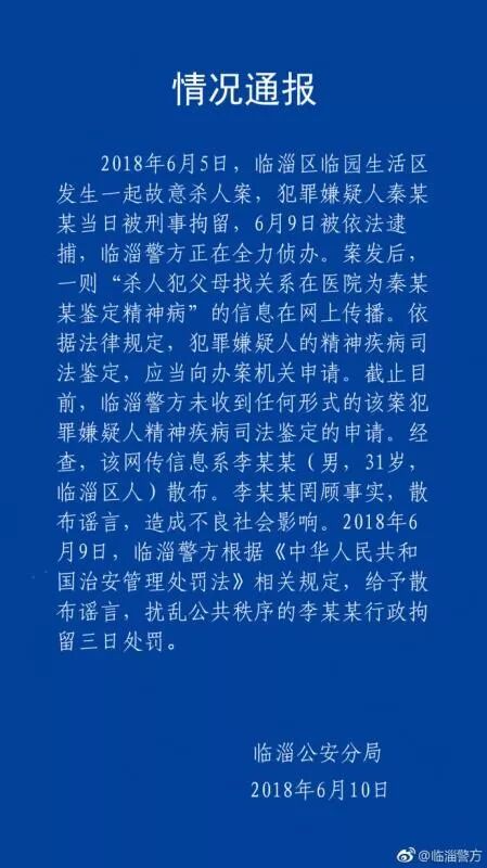 6月9日,@临淄警方 发布情况通报:【临淄警方迅速破获一起故意杀人案】 2018年6月5日18时50分许,在临淄区临园生活区发生一起刑事案件,犯罪嫌疑人秦某某将被害人马某某杀死。