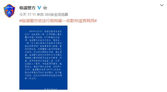 6月10日,@临淄警方 发布 #临淄警方依法行政拘留一名散布谣言网民#