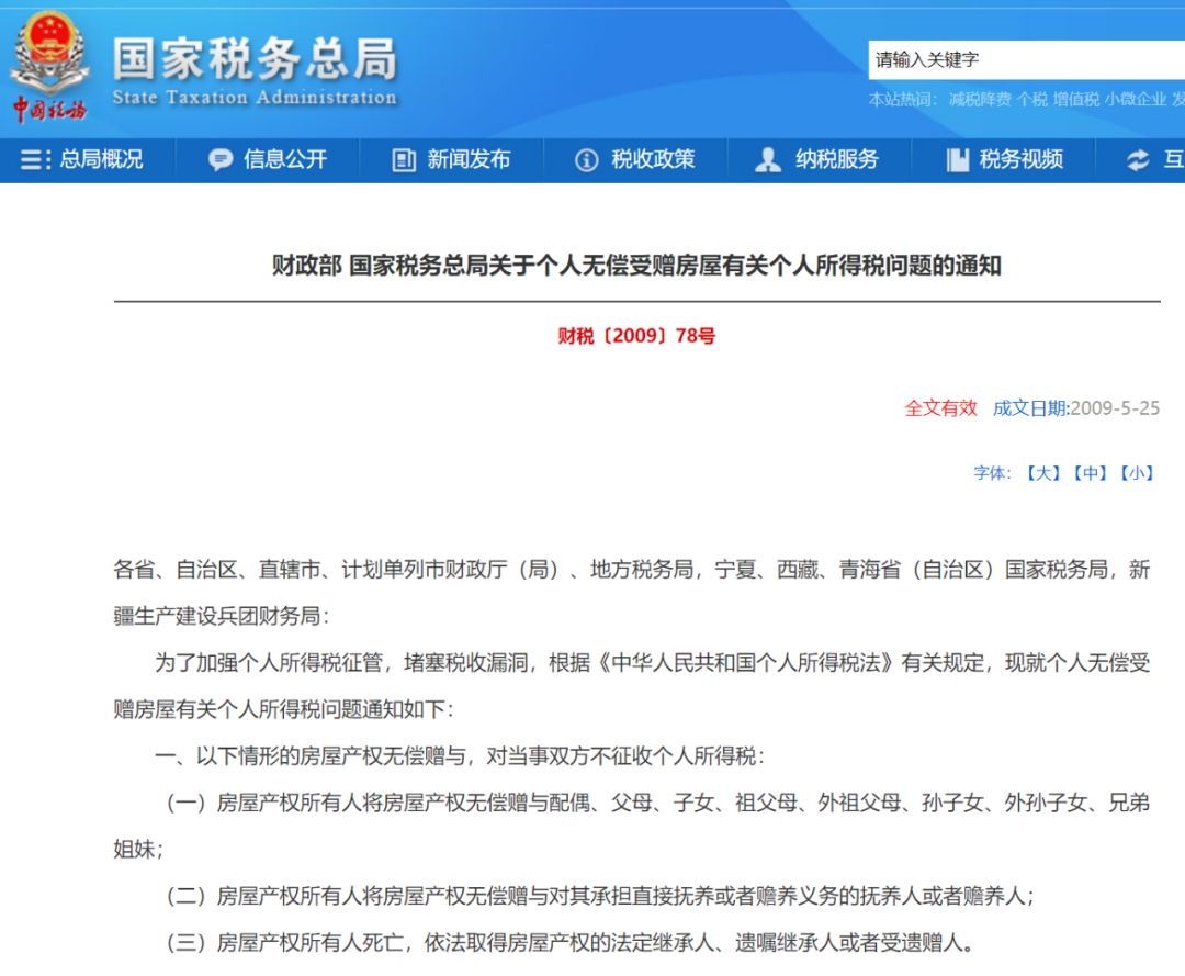 从以上条款可知,所谓“房产过户给近亲属不征收个人所得税”的最新消息就是按照2009年5月25日发布的《财政部、国家税务总局关于个人无偿受赠房屋有关个人所得税问题的通知》(财税〔2009〕78号)第一条规定执行。