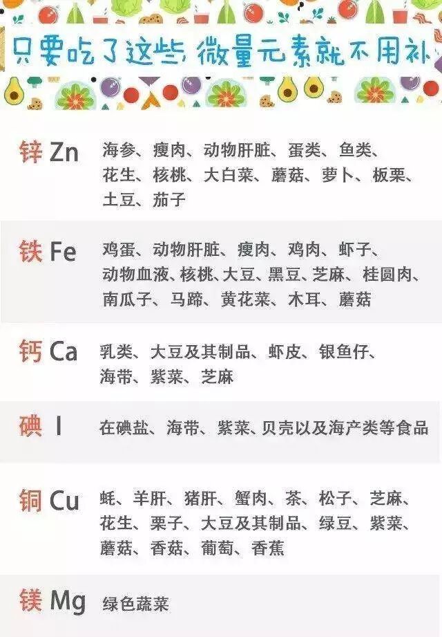 最后,拒绝做微量元素检查,让孩子少扎针,给自己和家人都省心省力。如果担心孩子饮食不均衡,倒不如按照下图通过食物补充。