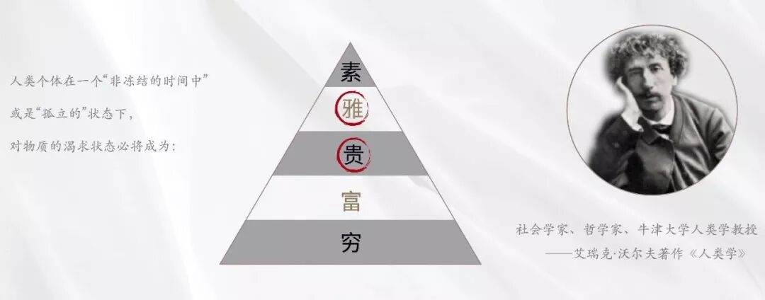 随着身份层次的分化,生活富足,精神安逸,逐渐成为城市新贵的心态。“贵”的需求随之产生,逐步追求奢华精装、社交平台、高端服务等享受,精神主义豪宅随即到来。与此同时,文化回归、智能化配置、高端智能化服务逐渐进入生活场景,人类步入物质追求第四阶段——“雅”,实现现代物质与精神追求和谐共处的生活方式。