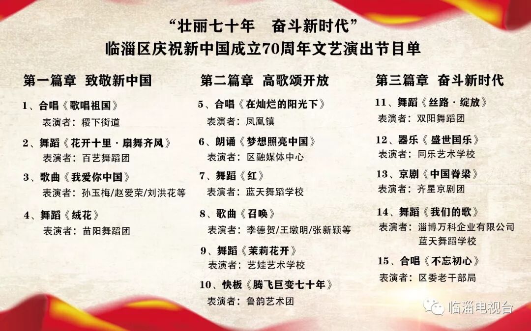 为庆祝新中国成立70周年, 丰富我区新时代文明实践活动载体,凝聚力量、鼓舞士气,展示全区干部群众的精神面貌,进一步活跃群众精神文化生活,营造欢乐喜庆祥和的节日气氛,将于9月28日举办 “壮丽七十年•奋斗新时代”临淄区庆祝新中国成立70周年文艺演出。