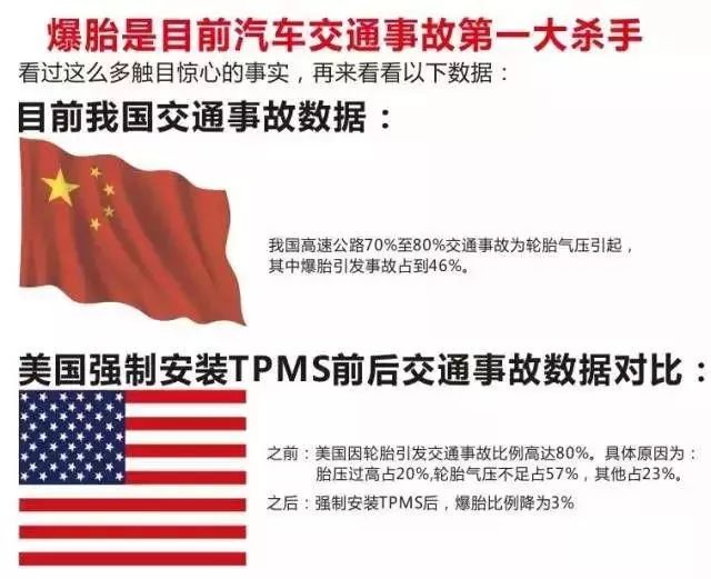这二十多万起的交通事故中,相当一部分是因为轮胎气压异常造成的,尤其是高速公路发生的事故,其中因轮胎爆胎引发的事故占了将近一半。如果安装了胎压监测器,事故的发生率会小很多。