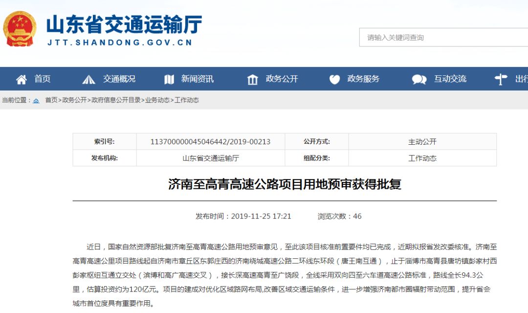 近日记者从山东省交通运输厅获悉,济南至高青高速公路项目用地预审已经获得国家自然资源部批复,至此,该项目核准前置要件均已完成,近期拟报省发改委核准。这预示着设计为双向四至六车道、路线全长94.3公里的高速路建设工程距离开建更近一步了。
