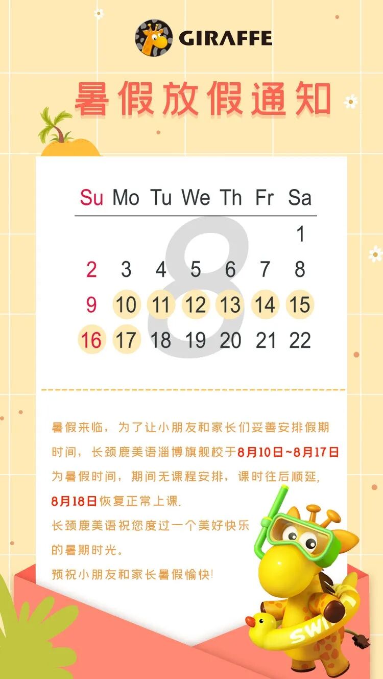 放假通知丨临淄长颈鹿美语暑假停课安排