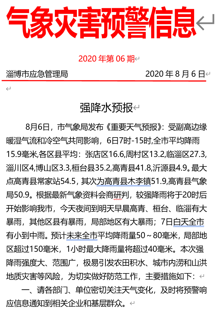 8月6日,淄博市气象局发布《重要天气预报》:受副高边缘暖湿气流和冷空气共同影响,6日7时-15时,全市平均降雨15.9毫米,各区县平均:张店区16.6,周村区13.2,临淄区27.3,淄川区4,博山区3.3,桓台县35.2,高青县41.8,沂源县4.9。最大点高青县常家站54.5,其次为高青县木李镇51.9,高青县气象局50.9。根据最新气象资料会商研判,较强降雨将于20时后开始影响淄博市,今天夜间到明天早晨高青、桓台、临淄有大暴雨,其他区县有暴雨,局部地区有大暴雨;7日白天全市有小到中雨。预计未来全市平均降雨量50~80毫米,局部地区超过150毫米,1小时最大降雨量将超过40毫米。本次强降雨强度大、范围广,极易引发农田积水、城市内涝和山洪地质灾害等风险,为切实做好防范工作,主要措施如下: