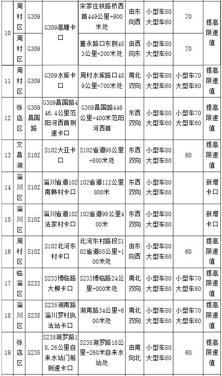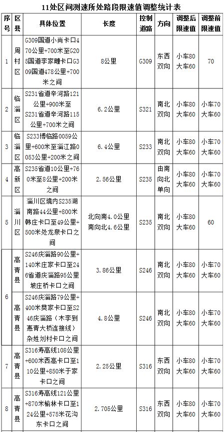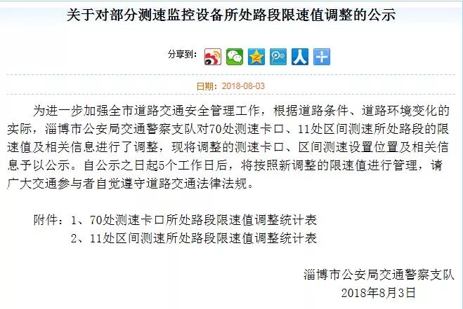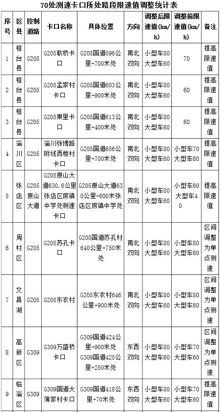 淄博市公安局交通警察支队对70处测速卡口、11处区间测速所处路段的限速值及相关信息进行了调整,今天,将调整的测速卡口、区间测速设置位置及相关信息予以公示...