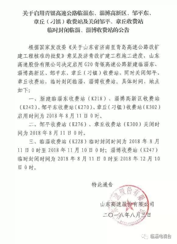 青银高速临淄收费站临时封闭,封闭时间为2018年8月11日0时至2018年11月10日0时。