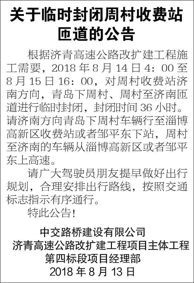 答:因济青高速公路改扩建施工,2018年8月11日0时至2018年11月10日0时,临淄收费站临时封闭;2018年8月11日0时至2018年12月10日0时,淄博收费站临时封闭。