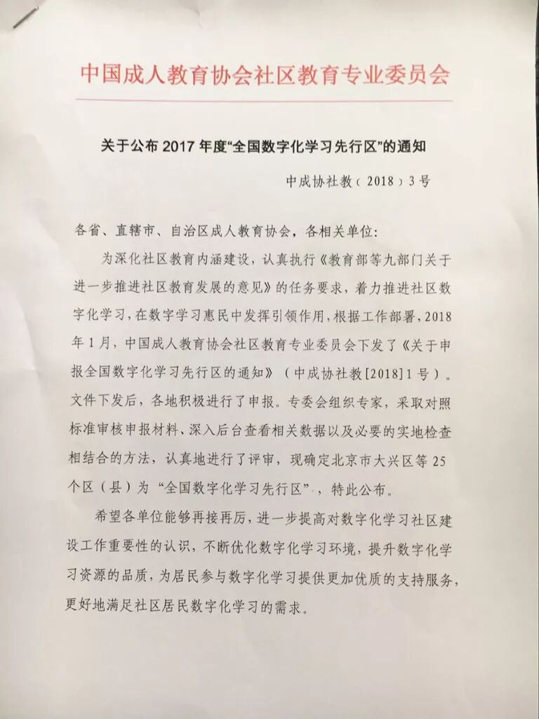 近日,中国成人教育协会社区教育专业委员会公布了全国“数字化学习先行区”评选结果,我区被评为“全国数字化学习先行区”。