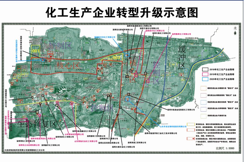 为了更好的推动化工行业转型升级,辛店街道制定了三年关停计划并明确了关停标准,初步确定2018年关停19家,2019年8家,2020年3家。目前,有9家企业已拆除和正在拆除,7家企业停产到位。