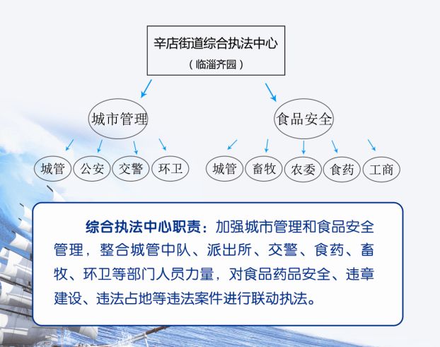 为提升城市综合治理能力,辛店街道率先在齐园规划建设了综合执法中心,整合城管、公安、交警、工商、食药、环卫、农业等多方执法力量,针对城市管理难题及食品药品安全问题进行联动执法。目前,城管已经入驻并开展工作,其它部门将相继入驻。