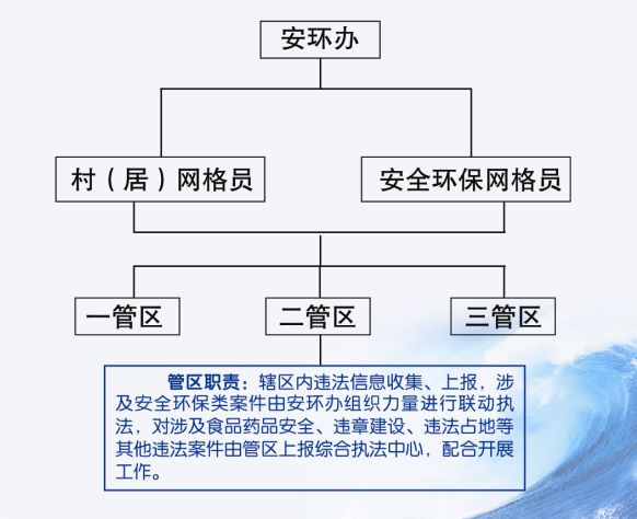 由街道安环办牵头负责,整合村(居)网格员及安全环保网格员,在辖区范围内成立三个管区,负责辖区内违法信息的采集、上报。