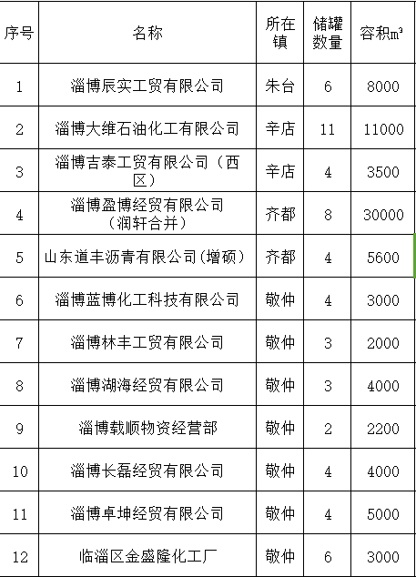 通过排查,临淄区共有一般化工储存企业(业户)243家,主要从事沥青、重质燃料油的存储销售。共涉及立罐1152个,总容量约190万立方米。由临淄区安监局牵头,镇办具体负责,对全区243家一般化工存储企业坐落位置、罐容、存储介质、存储量和取得手续情况,进行了全面摸底,一企一册,建立起完整的档案资料。