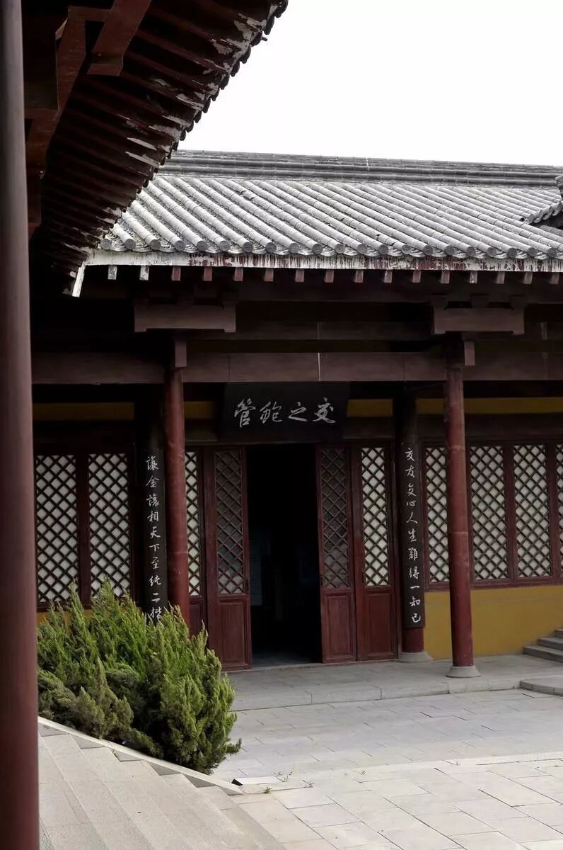 管仲纪念馆 管仲纪念馆依山而建,大门阙楼上书“管仲纪念馆”五字,两旁楹联:“相桓公霸春秋一匡天下名千古,富民众强家国九合诸侯顺八方”,概括了管仲一生的历史功绩