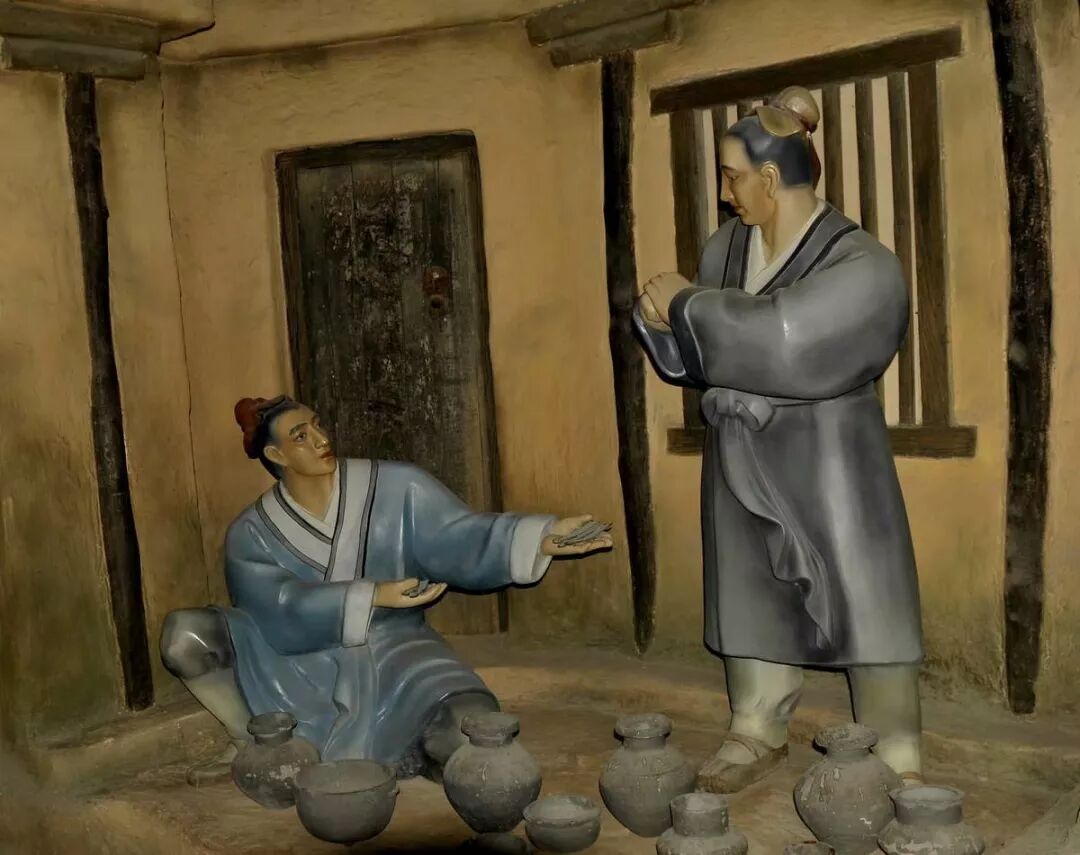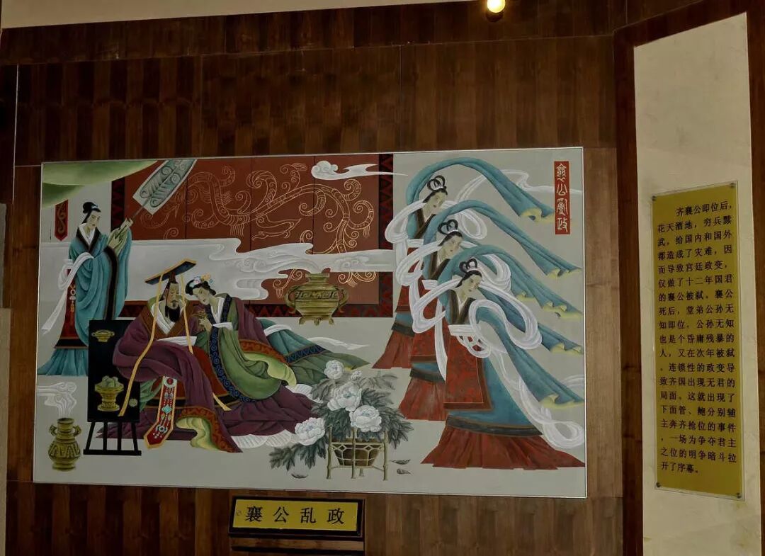 管仲纪念馆“管鲍之交”展厅。门前的楹联是“交友交心人生难得一知己;让金让相天下至纯二楷模”