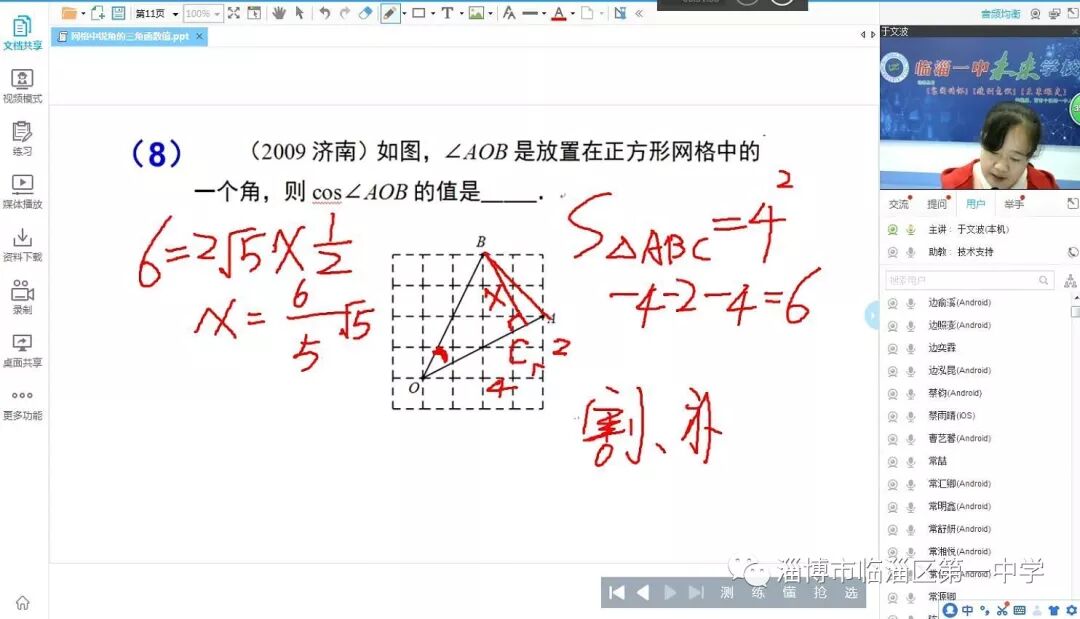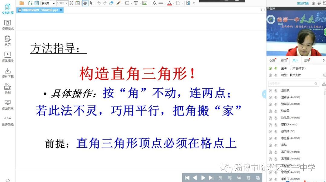 9月20日晚上7点,临淄一中“未来学校”第一堂课顺利开课。首先由公司技术人员在线对学生进行简单培训,以保证学生能够顺利学习;然后,由我校数学学科主任于文波老师做了“网格中锐角的三角函数值”的专题讲座。初四级有四百余名同学同时在线学习。