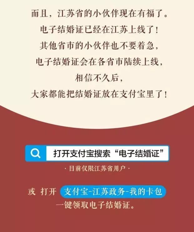 在江苏已经登记结婚的夫妻,只要打开支付宝搜索“江苏政务”,在“我的卡包”里刷脸就能领取到和实体证相对应的电子结婚证。