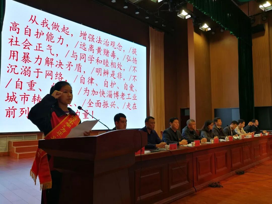 为深入学习宣传习近平新时代中国特色社会主义思想和党的十九大精神,贯彻落实“两法两条例”精神,有效预防青少年违法犯罪,服务青少年健康成长发展,10月18日上午,由市综治委“预青”专项组、团市委、市中级人民法院、市人民检察院、市综治办、市教育局、市公安局、市司法局、市文化市场执法局联合主办,临淄团区委、区教育局承办的淄博市暨临淄区青少年“二禁四防”主题教育活动启动仪式在我区淄江中学顺利举行。